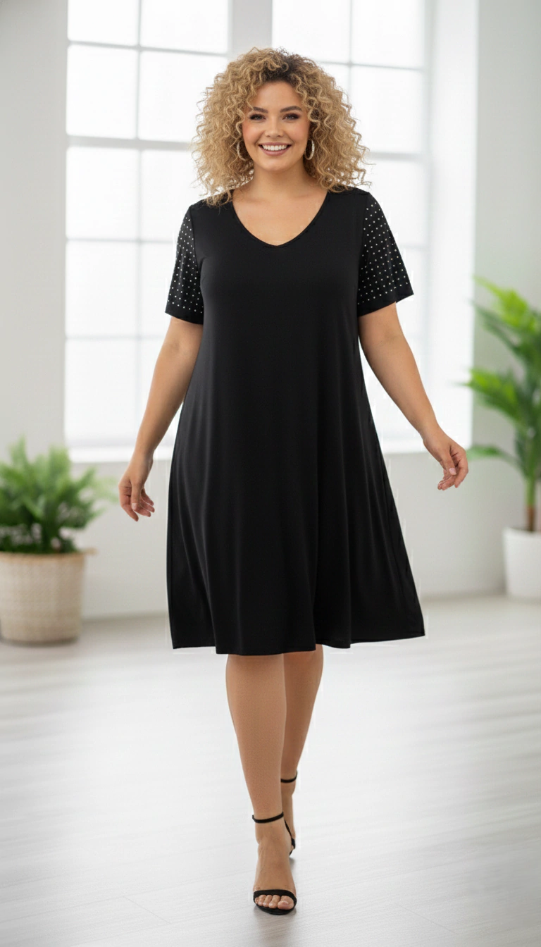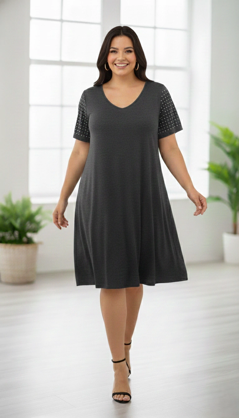 Vestido evasé de modal, súper cómodo y fresco, ideal para todos los días o para una salida casual. Tiene cuello en V, mangas con tachitas delicadas que le dan un toque canchero y un moño en la espalda también con tachitas, que lo hace único y femenino.